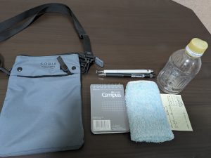 行先によって持っていくものは多少変わりますが、だいたい共通しているのは「筆記用具」「飲み物」です。